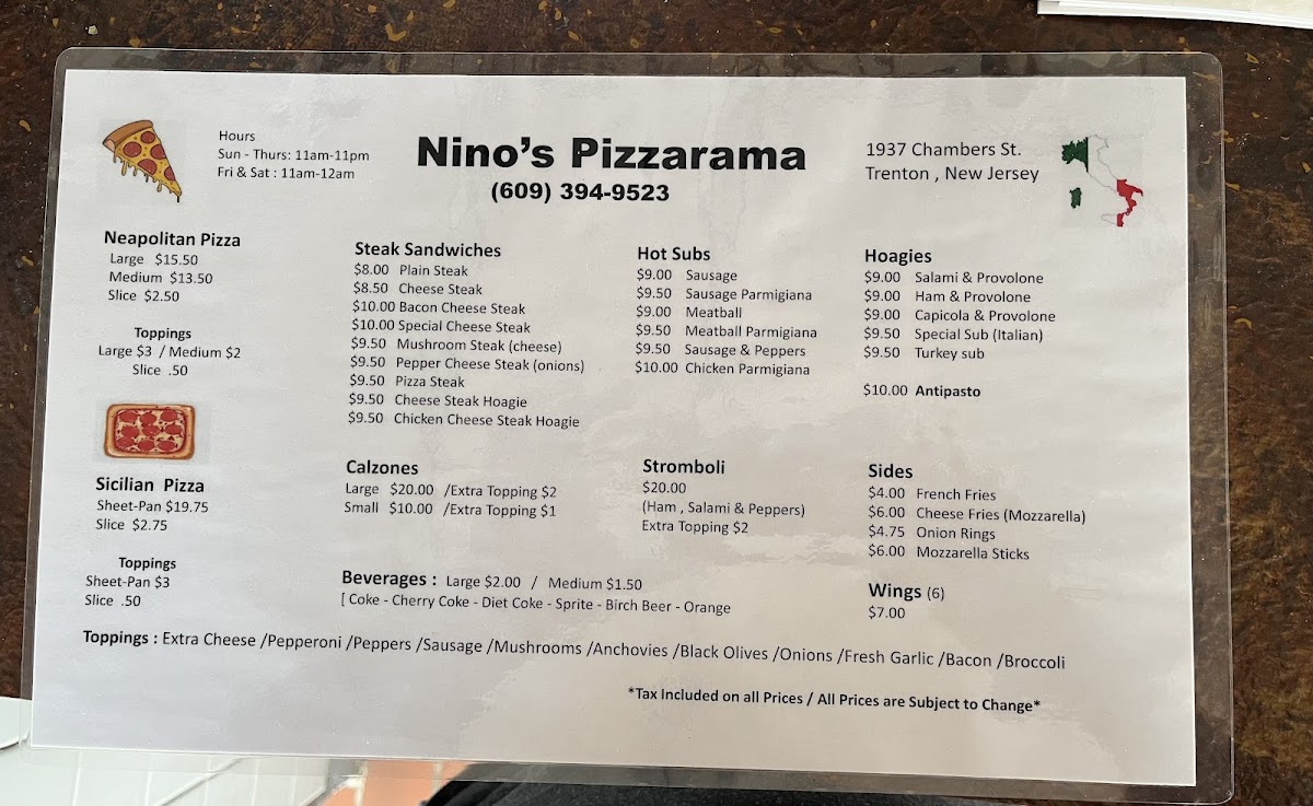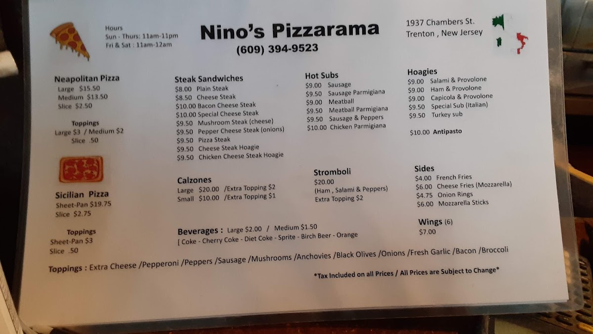 Welcome to Nino's Pizzarama, a gem nestled in Hamilton Township, New Jersey. Located at 1937 Chambers St, this family-owned pizzeria has proudly stood the test of time, preserving the authentic Italian flavors that have made traditional pizza a culinary staple. With a commitment to quality and simplicity, Nino's offers a menu that focuses solely on classic pizza options and hearty cheesesteaks. Forget the trendy toppings and quirky combinations; here, you’ll find the comfort of straightforward, delicious food.